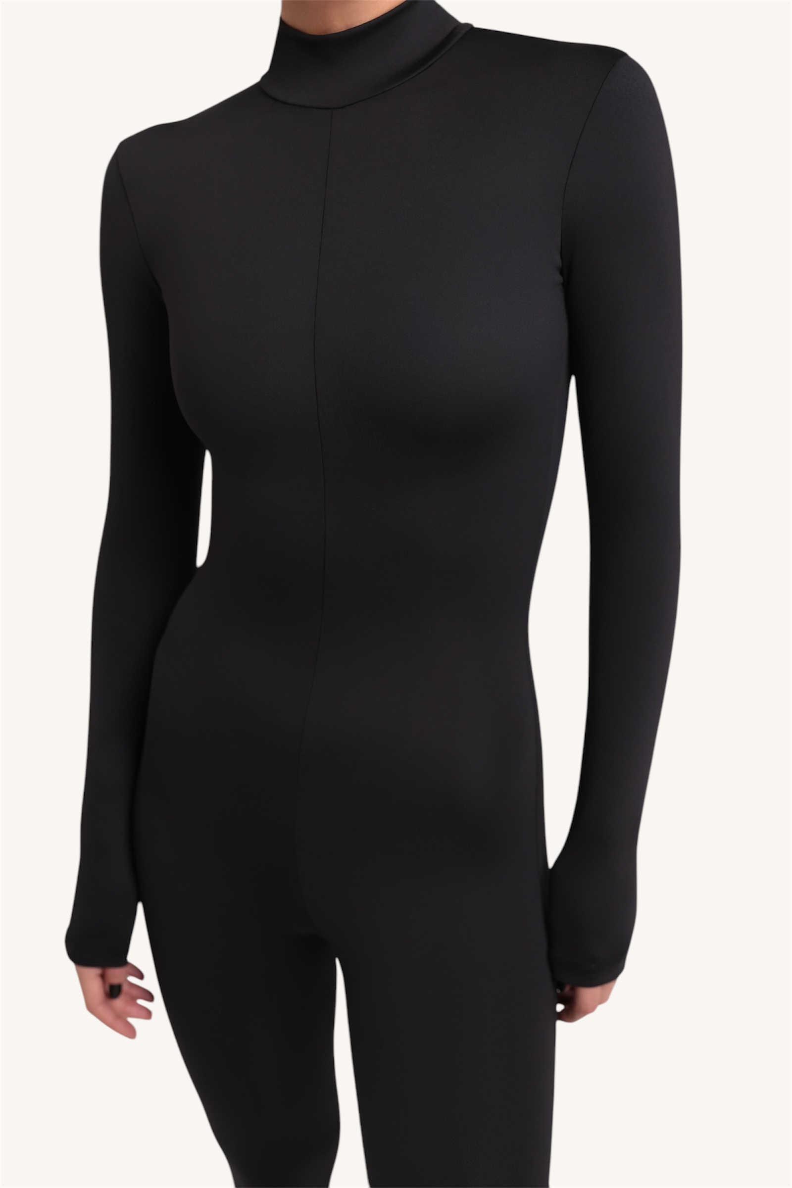 • The bodycon one-piece outfit essential features a high neckline with long fitted sleeves and legging style bottoms with shoulder strap